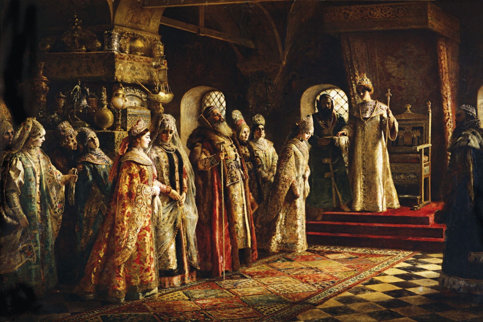 Царица предстает перед послами в сложном одеянии: